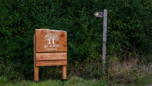 Search metals.hazel.noon within the What3Words app, or click on the link below. This will take you directly to the junction to turn off the road, where you will see a large oak sign with ‘Hermitage at 42 Acres’ in white writing. Keep following the main track, through the gates and over the small bridge until you reach the main courtyard and car park.